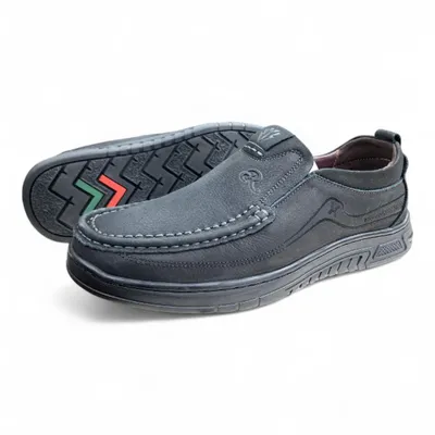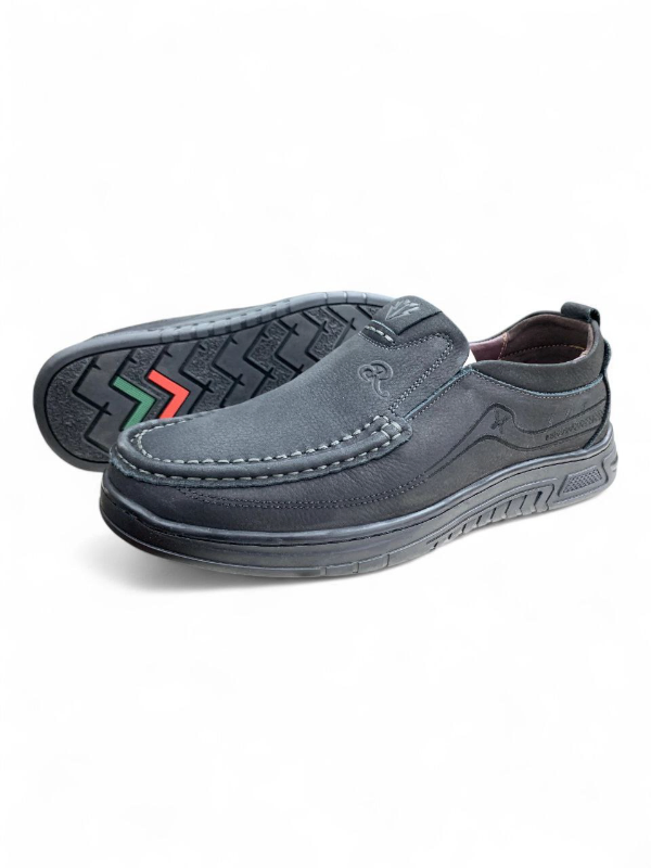 Black Moccasin Slip-On Shoes — Chevron Sole Grip & White Stitch Detailing | Footmax.com.bd