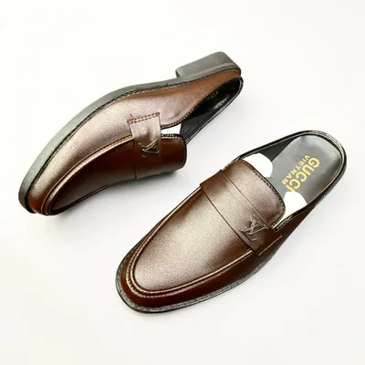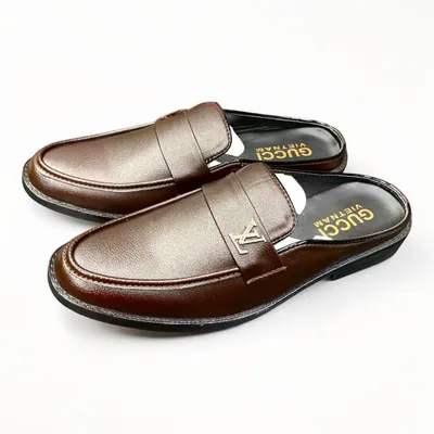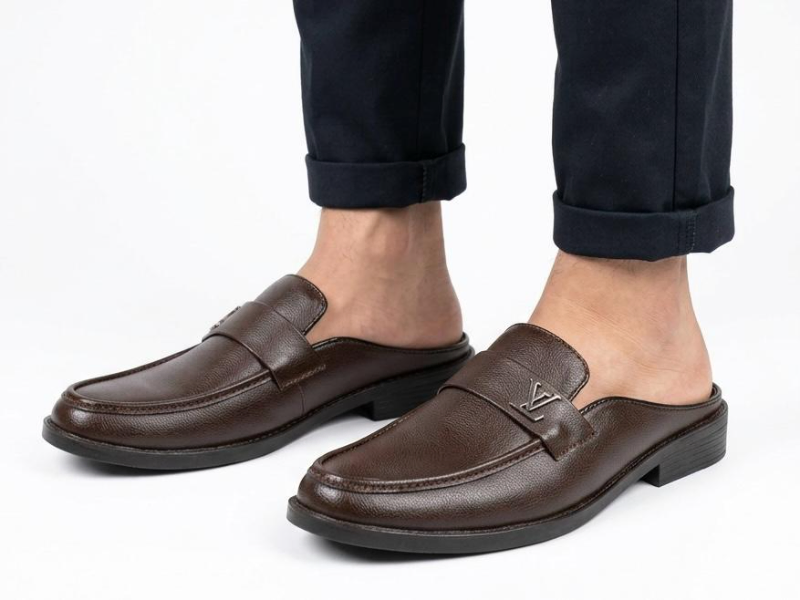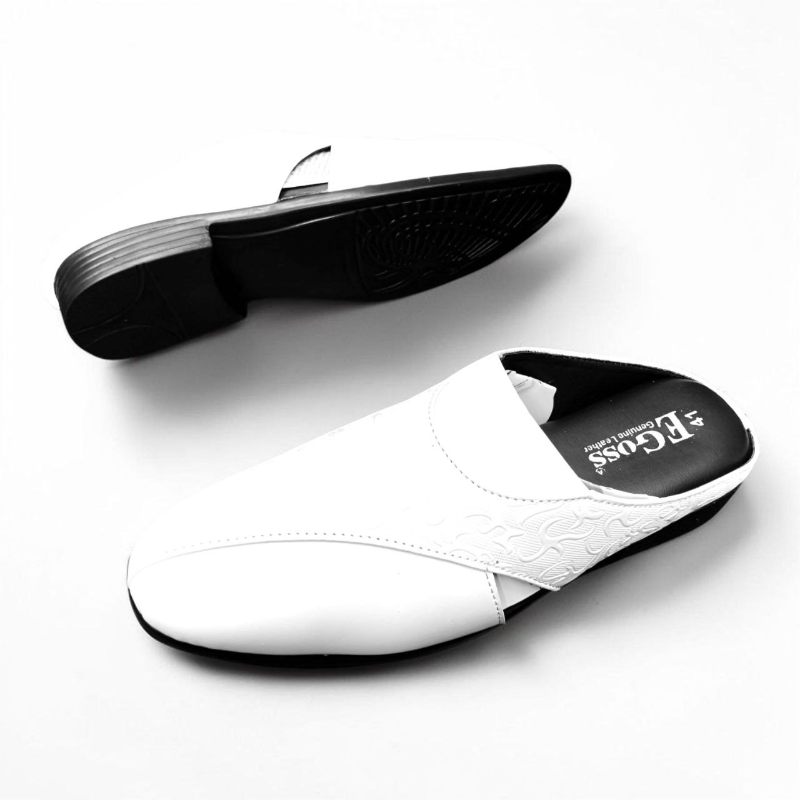 • Details: Backless design, moccasin toe, emblem accent