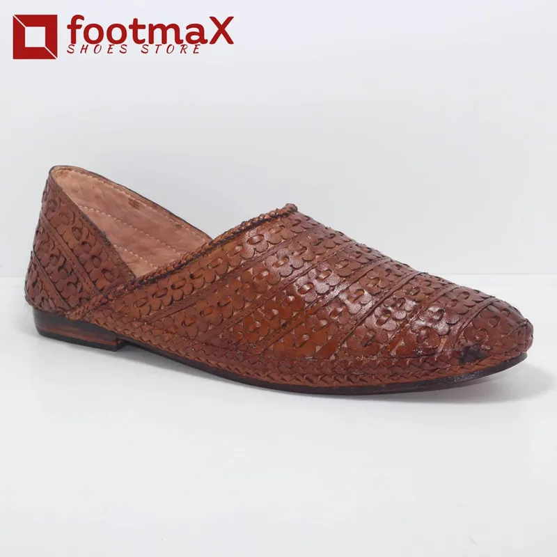 Handcrafted Men’s Leather Nagra / Jutti – Brown Embossed Design – Traditional Style