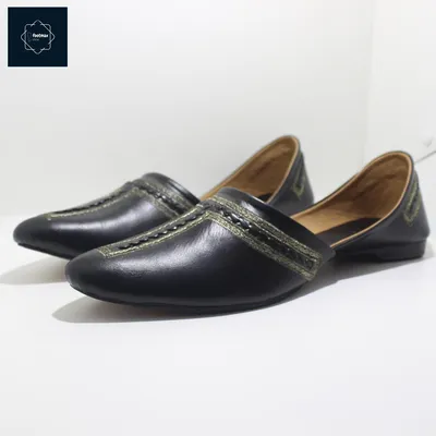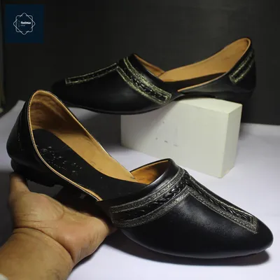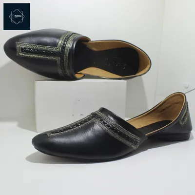 Elevate your style with these exquisite women’s black leather ethnic flats, brought to you by Footmax. Handcrafted with meticulous attention to detail, these flats feature a sleek black leather upper adorned with intricate woven and metallic thread detailing, inspired by traditional ethnic designs. The pointed toe and low-cut silhouette add a touch of sophistication, making them perfect for both casual and semi-formal occasions. The soft leather lining ensures all-day comfort, while the durable sole provides reliable traction. Step into a world of timeless elegance with these unique flats, exclusively available at Footmax.