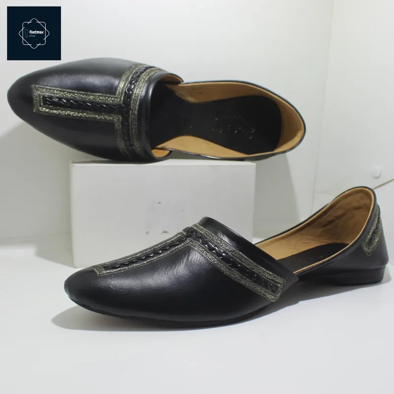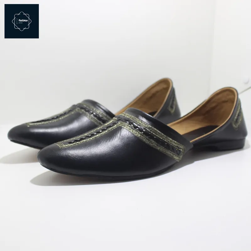 Men Black Leather Ethnic Flats – Handcrafted Elegance-nagra shoes for all leather