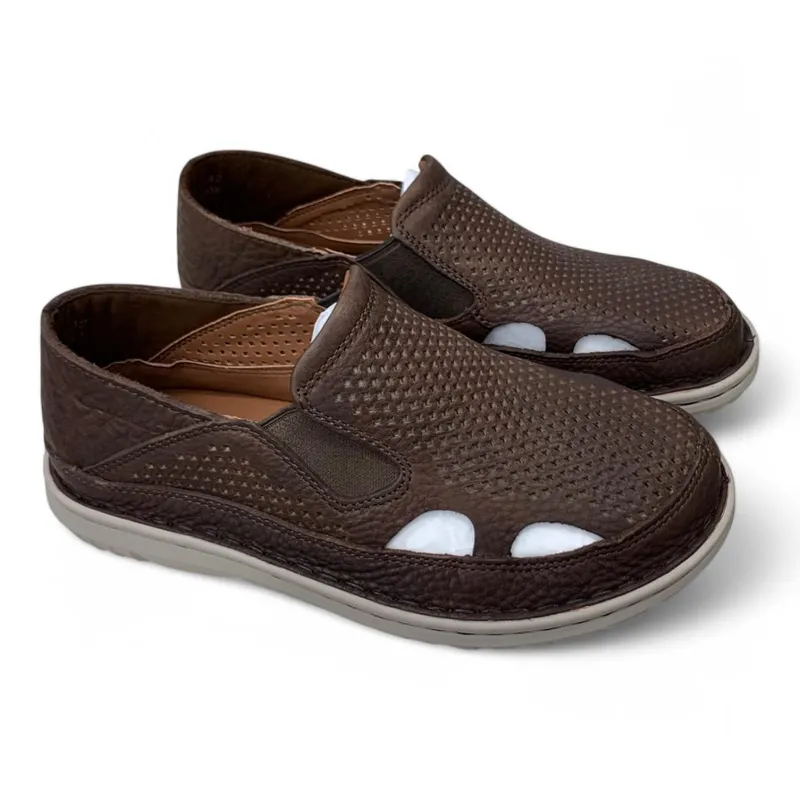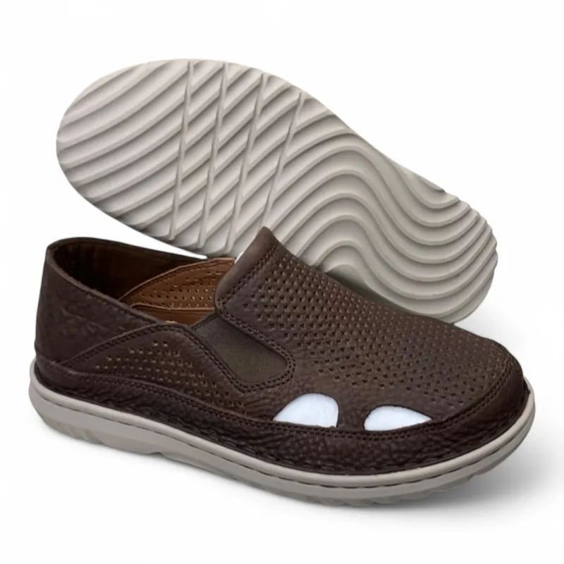Experience everyday comfort and effortless style with these Royal Cobbler men’s casual slip-on shoes. Made in Vietnam, these shoes are perfect for navigating the busy streets of Dhaka, Bangladesh. They feature a unique perforated brown leather upper, offering breathability and a stylish look. The elastic side panels ensure a snug and comfortable fit, while the cushioned insole provides all-day support. The lightweight and flexible outsole offers reliable traction, making them ideal for walking and everyday activities.