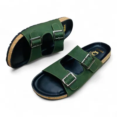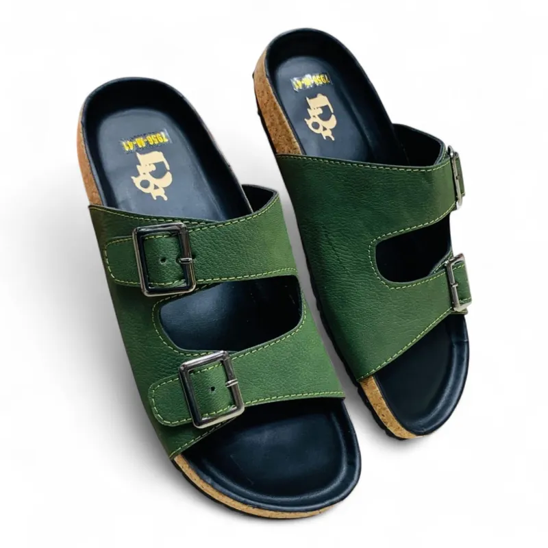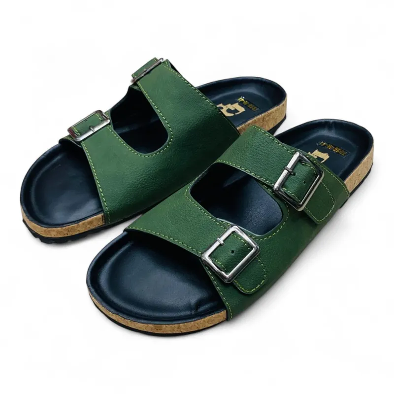 These sandals feature two adjustable wide straps in a rich forest green hue, crafted from a durable and comfortable material (likely synthetic leather or PU) with contrasting stitching. Each strap is fitted with a sleek black or silver-toned buckle, allowing for a customizable and secure fit. The prominent cork-inspired midsole not only adds a touch of natural aesthetic but also contributes to cushioned comfort. A sturdy black outsole provides reliable traction, making these sandals perfect for navigating the city streets or enjoying a relaxed day out in Dhaka.