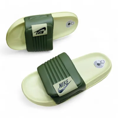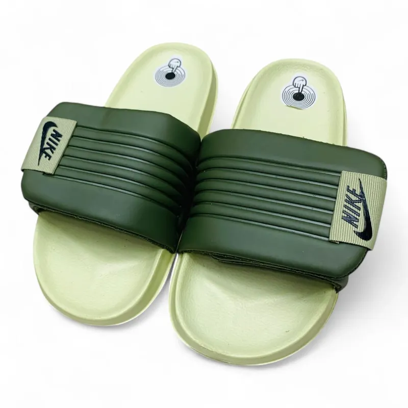 These stylish slides feature a soft, contoured footbed in a light cream or yellow hue that provides plush cushioning with every step. The wide, olive green synthetic strap boasts a ribbed design and an adjustable velcro closure with a subtle Nike logo patch, ensuring a customized and secure fit for all-day comfort. The lightweight construction and durable sole make them a practical yet fashionable choice for any casual occasion in Dhaka’s warm climate.